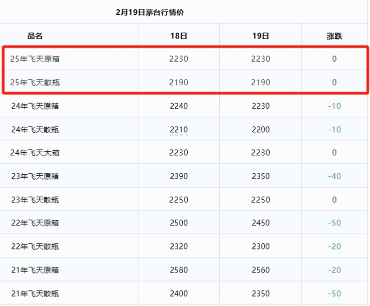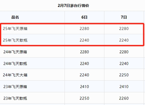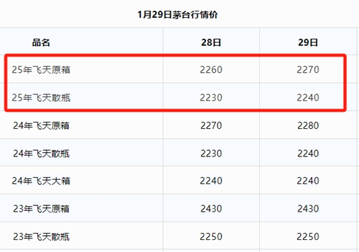 春节后,茅台开始陆续发货。从市场批价表现可以看到,春节结束后至今,飞天散瓶批价下跌了50元左右。2025年飞天散瓶跌破2200元,而以往年份的老酒则跌价更多。